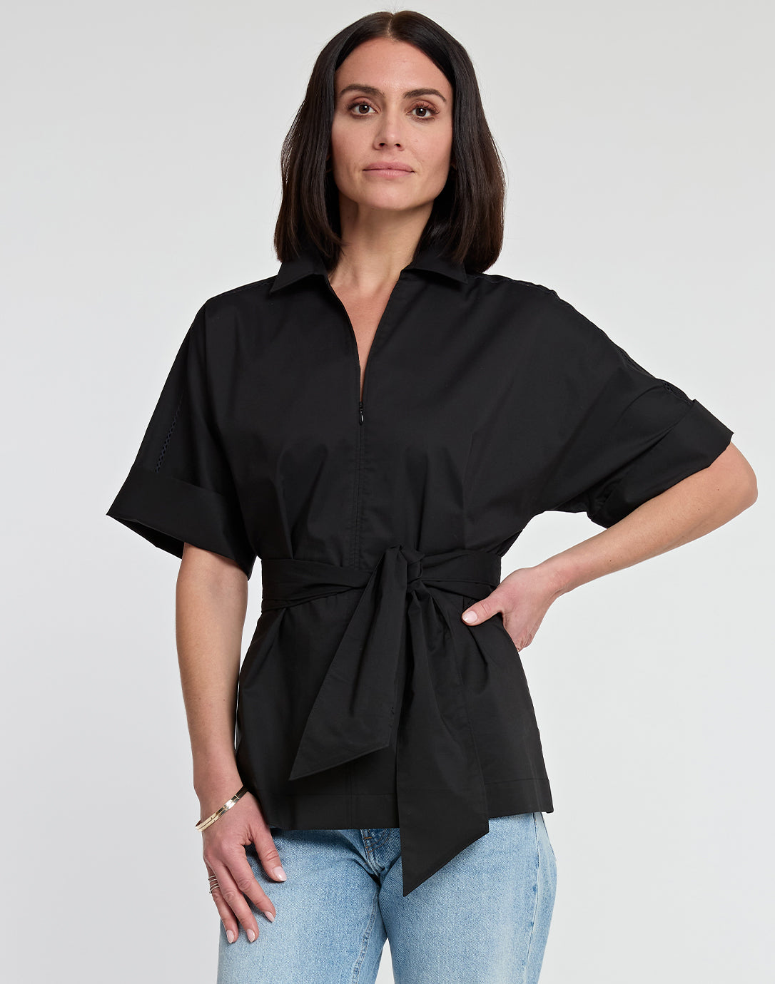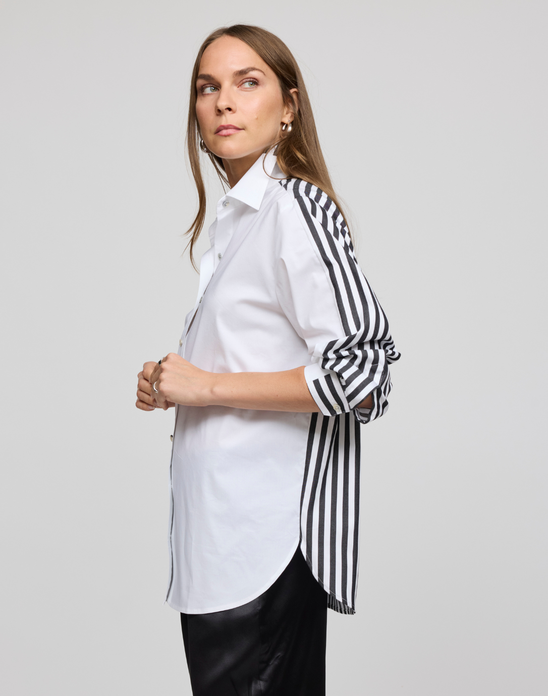 Woman wearing a white blouse with double cuff sleeves against a plain background