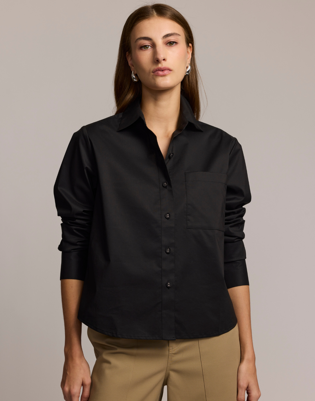 Woman wearing a black shirt and beige pants against a neutral background