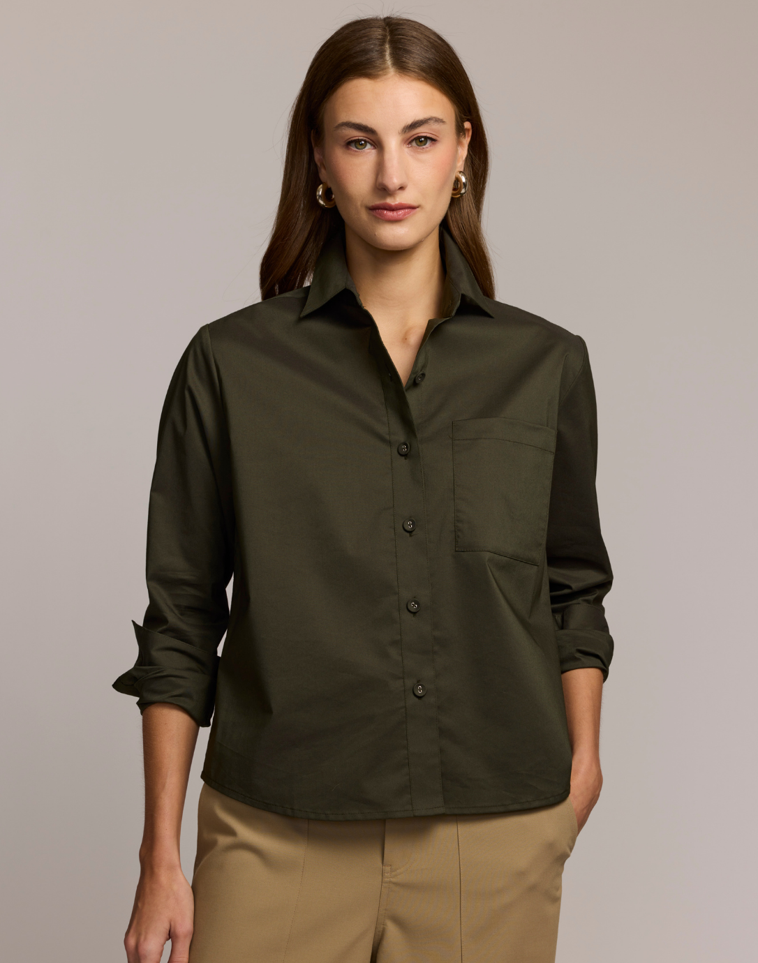 Woman wearing a dark green shirt with rolled-up sleeves against a neutral background