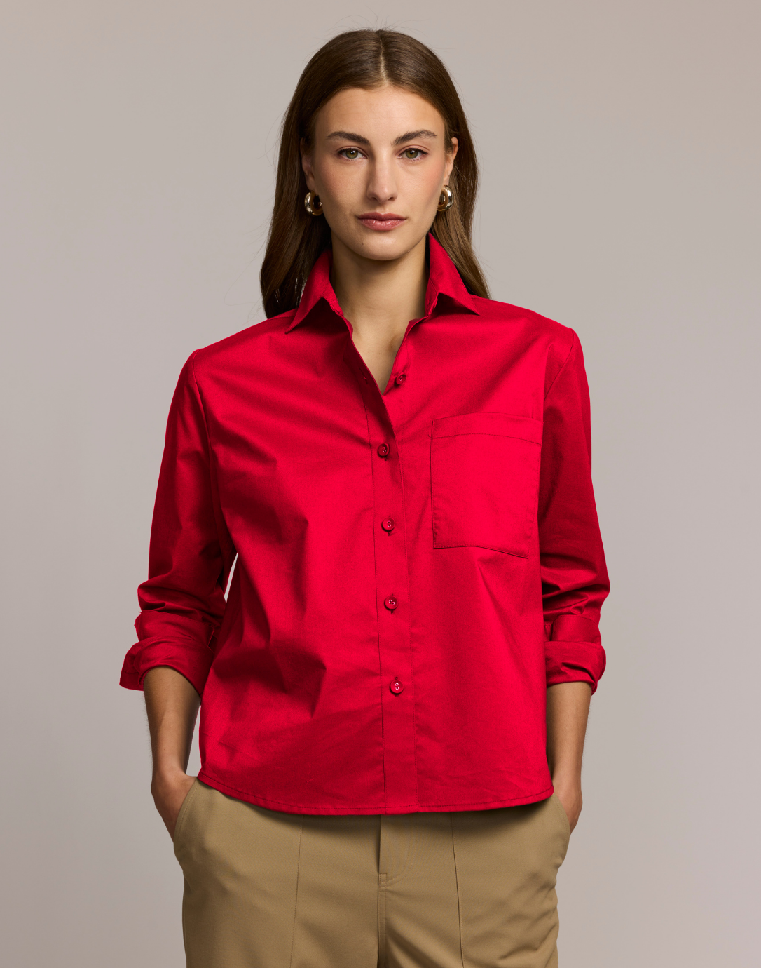 Woman wearing a red shirt against a plain background